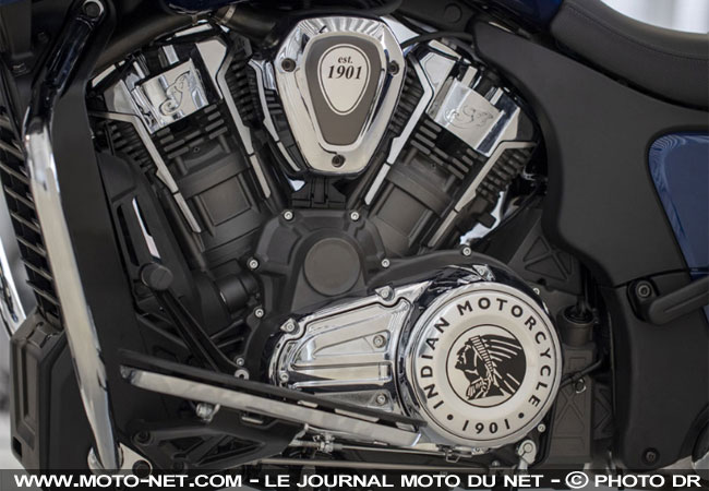 Cet énorme moulin présenté la semaine dernière aux Etats-Unis est moderne pour ce genre de motos : 4-soupapes par cylindre, accélérateur électronique (avec trois modes de conduite), embrayage multidisques en bain d'huile, boîte 6-vitesses et refroidissement liquide. On retrouve ici des caractéristiques défrichées sur les twin Victory, feue la marque custom de Polaris.