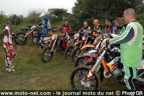 Après Cyril Despres, l'ancien pilote tricolore s'est prêté de bonne grâce à cet événement réunissant une dizaine de passionnés de tout-terrain. Fort de sa vaste expérience en la matière, Éric Bernard a pris son rôle au sérieux et s'avoue volontiers très satisfait de cette journée bien chargée : "ce genre d’expérience est assez inédit pour nous et je pense qu’il y avait autant de stress pour les pilotes participants que pour le staff qui les accueillait !", avoue le pilote. "Heureusement, une fois le premier contact établi, tout le monde s’est libéré et c’est une ambiance aussi joyeuse que studieuse qui a très vite envahi l’atelier. Je souhaitais, avant de travailler le pilotage, sensibiliser les pilotes à l’importance des réglages à faire sur leur moto. Michel, mécanicien au service des sports, a passé la journée avec nous pour aider à la mise en pratique des principes de base de la carburation, des suspensions, du nettoyage ou de l’entretien. Nous nous sommes ensuite rendus sur notre terrain d’entraînement pour déjeuner et passer au programme de l’après-midi : le pilotage. Les pilotes ont travaillé sur différentes spéciales, les virages à plat, les attitudes sur la moto, un peu de franchissement. La journée s’est terminée sous une petite pluie fine avec des stagiaires heureux, mais bien fatigués !"
