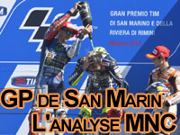 Et si Jorge Lorenzo et Dani Pedrosa complètent assez logiquement le podium, leur impuissance à jouer la victoire (le n°99 et le n°26 terminent à respectivement 1,578 sec et 4,276 sec du n°46) compte aussi parmi les événements marquants du week-end. Autre sujet brûlant à San Marin : le mercato MotoGP (lire notamment MNC du 13 septembre : dernières rumeurs à Misano).