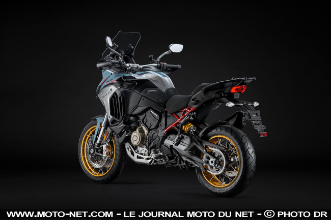 Le constructeur italien lui greffe davantage de gadgets fonctionnalités pour 2026. Un nouvel algorithme affine les réactions de l'armada électronique (IMU et 70 capteurs !), tandis que son éclairage s'améliore. Son amortissement piloté par électronique intègre la fonction d'abaissement en dessous de 10 km/h : pas du luxe avec une machine d'environ 270 kg avec le plein, dont la selle se règle entre 870 et 890 mm !