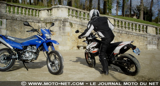 Forcément, avec son modeste 110 km/h en rupture du cinquième et dernier rapport, la Suzuki ne voit pas le jour lorsque l'horizon se dégage. Pire : en descendant de la Senda DRD, les reprises mollassonnes de la DR125SM semblent alors totalement anémiques et surtout dénuées de la moindre once de caractère...