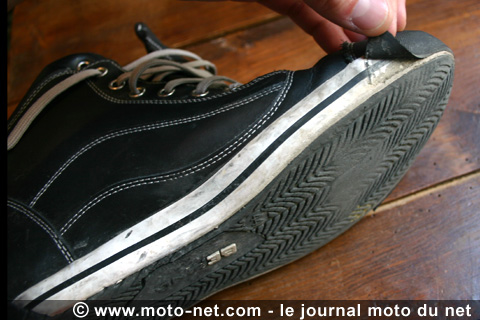 Après plus d'un an de roulage en notre compagnie (pas tous les jours, mais par tous les temps sur plus de 4000 km), les baskets Bering montrent un seul signe de fatigue : la semelle est usée au niveau des repose-pieds et les repères d'usure sont atteints - ne les cherchez pas, c'est une façon de parler...