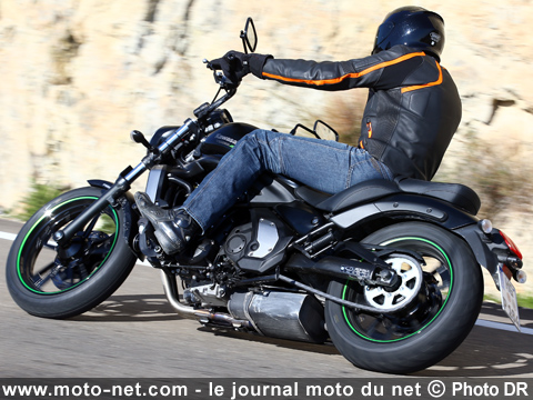Sur un revêtement im-pec-cable, le Journal Moto du Net s'en donne à coeur joie et se rend compte que les responsables Kawasaki n'exagérait pas durant leur conférence : l'ADN Kawa est là. MNC dirait même plus : il coule dans les veines de ce Vulcan S un sang aussi vert que celui de Monsieur Spock des ER-6 !