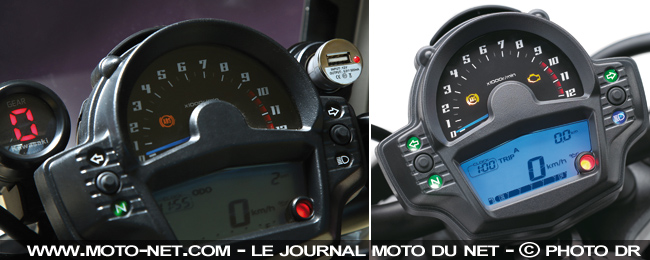 Moto-Net.Com en profite pour signaler que le témoin de rapport engagé est disponible en option, comme c'est le cas sur la toute dernière Versys 650. Une prise 12 V peut également être installée de l'autre côté du compteur emprunté à l'ER-6n, donc particulièrement complet comparé aux traditionnelles instrumentations de customs.