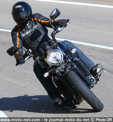 Sur petites routes, la plage d'utilisation de "ce" moteur de petit cruiser s'étale finalement de 3000 à 7500 tr/min. Pour se balader sans se trainer, on peut compter sur le couple maxi de 63 Nm placé à 6600 tr/min et on jongle entre les troisième et quatrième rapports.