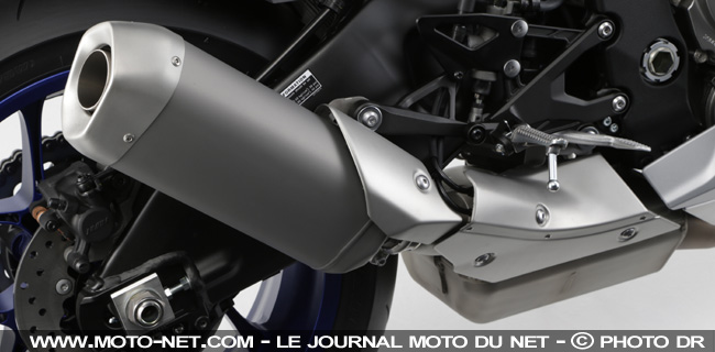 La R1 2015 fait appel à un nouveau système d'échappement (4-2-1 toujours) constitué de titane. Les quatre tubes du collecteur se rejoignent deux à deux et débouchent sur la principale chambre de 5,2 litres, placée au plus bas de la machine.