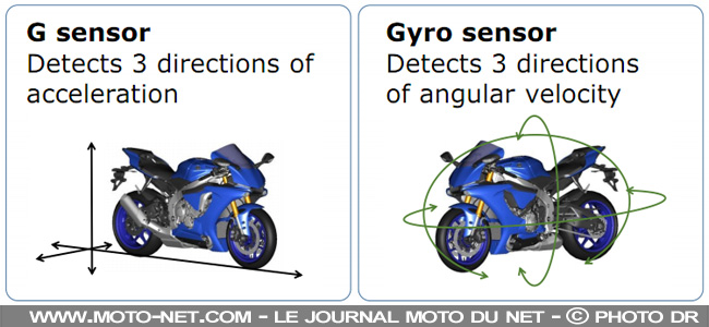 Grâce à lui, le tangage, le roulis et le lacet de la moto sont constamment mesurés, de même que les accélérations sur les axes avant/arrière, gauche/droite et haut/bas. Autant de données qui permettent au fameux ECU, le cerveau de la R1, d'ajuster le volume d'essence injecté, le calage d'allumage et l'ouverture de papillons des gaz.