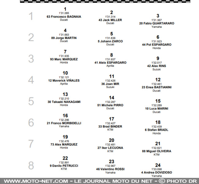 L'officiel Yamaha aura cependant fort à faire contre l'armada Ducati : le constructeur italien place quatre de ses motos sur les deux premières lignes , avec celles de Jorge Martin et de Johann Zarco aux 4ème et 5ème positions devant les Honda-HRC de Pol Espargaro et de Marc Marquez.