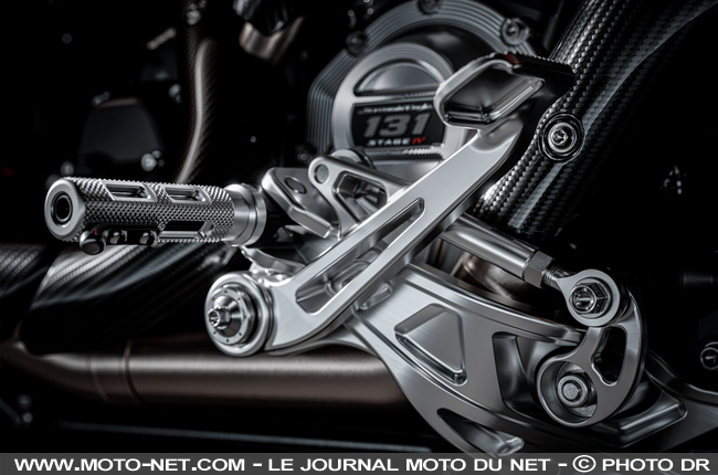 L'équipement et les périphériques ne sont pas en reste avec une fourche inversée Öhlins "FGR 253" de 43 mm, entièrement réglable et installée sur des tés en aluminium. A l'arrière, ce sont des combinés du même fabricant qui remplacent les Showa d'origine. Leur réservoir déporté prend place au-dessus des sacoches, par ailleurs fabriquées en carbone.