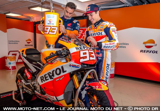 Repsol - sponsor-titre historique du team officiel Honda - est le premier à présenter un carburant décrit comme "renouvable" à destination des MotoGP : le pétrolier espagnol s'est adjoint les services du pilote vedette du HRC, Marc Marquez, pour une démonstration sur le circuit de Jarama (Espagne).