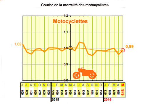 Bizarrement pourtant, le mois de mai 2016 n'affiche pas de hausse particulièrement marquée par rapport à 2015 pour les usagers de 2 et 3-roues de grosse cylindrée (voir graphique ci-contre). La lecture détaillée du bilan de l'ONISR confirme même que sur douze mois glissants, "les mortalités des piétons et des deux-roues motorisés sont globalement équivalentes".