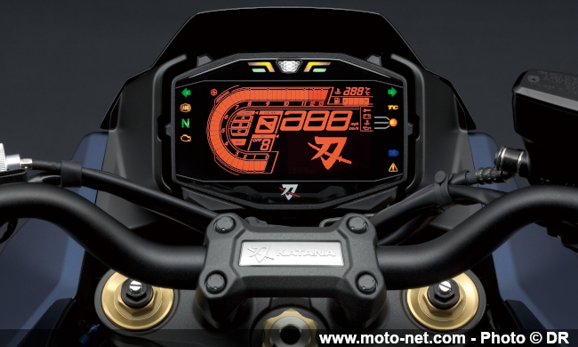 Parallèlement, la greffe d’une commande des gaz ride-by-wire permet l’apparition de modes de conduite sur la Katana. Avec le Suzuki Drive Mode Selector (SDMS) et via les commandes au guidon, le pilote peut jongler entre trois cartographies moteur : mode A comme Active, B comme Basique ou C comme Confort. Plus ou moins douces en termes de réactivité, toutes donnent accès à la puissance maxi.