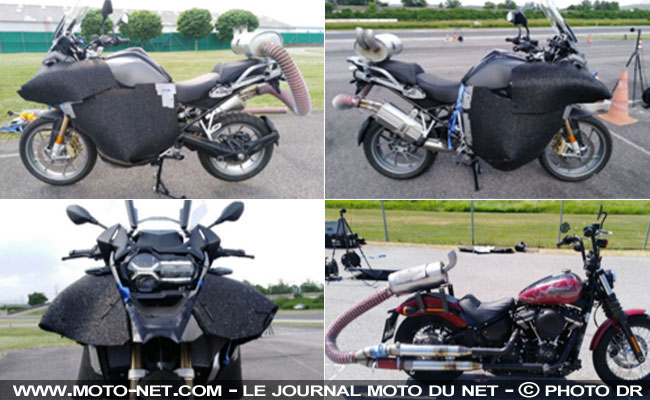 Les modèles testés - homologués Euro5 - sont dans l'ordre alphabétique : BMW R1250GS, Harley-Davidson Street Bob, Honda Forza 125, Kawasaki Vulcan S, KTM 390 Duke, Piaggio Vespa 300GT, Triumph Street Triple 765 et Yamaha Tmax 560. Tous se sont vus plus ou moins "enrubannés" pour déterminer le gain sonore maximal, avec à la clé un surpoids jusqu'à 32 kg pour la BMW et jusqu'à 35 kg pour la Harley !