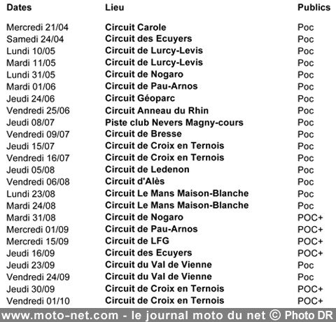 Pour leur 7ème édition, les POC - c'est leur surnom officiel - proposent aux motocyclistes français pas moins de 24 rendez-vous sur 15 circuits différents. L'inscription à l'une de ces journées se fera en ligne à partir du 15 mars prochain.