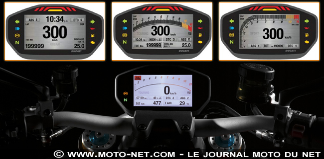 Essentielle, la vitesse est heureusement parfaitement lisible sur la Kawa. Or ce n'est pas toujours le cas sur la magnifique dalle de la Monster 1200 : lorsque le soleil tape dans le dos, on ne peut tout simplement plus rien voir des informations qui varient selon le mode de conduite adopté.