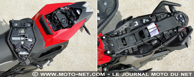 On retiendra ainsi que des petits patches de gomme transparente assurent une meilleure tenue du réservoir, que des valves coudées évitent de se salir les gants et qu'un espace de rangement sous la selle passager peut accueillir un bloque-disque. Ce n'est pas énorme, mais c'est mieux que rien... donc mieux que les trois concurrentes !