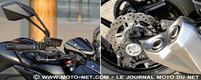 La firme d'Akashi a mieux bossé que celle de Mattighofen en termes de finition : carters moteur travaillés, injection camouflée à gauche - mais pas à droite, dommage ! -, sortie de pot polies, excentriques pour régler la tension de chaîne, bocaux de liquide fumés, sigles "Kawasaki" sur les étriers et petits "Z" sur la selle.