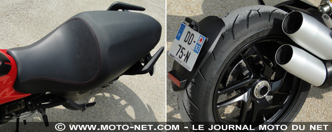 La Ducati, à l'inverse, est bien moins adaptée aux grands (plus d'1,75m) : les genoux cognent contre le réservoir tandis que le mollet droit se colle au pot, dont la protection prévient peut-être de graves brûlures mais n'a pas le pouvoir de dissiper la chaleur !