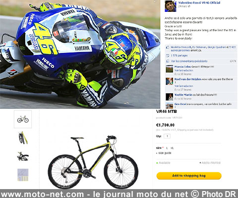 De son côté, la liste des produits dérivés "VR46" de sa boutique en ligne (une source de revenus non négligeable pour un sportif de sa dimension) n'en finit pas de s'agrandir : depuis les habituels vêtements et maquettes de moto jusqu'au VTT stické "Rossi" (1700 €) !