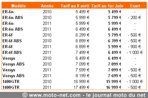 Seul modèle "naked" à bénéficier d'une ristourne supplémentaire cet été, la version ABS de 2010 passe de 5999 à 5799 €. Les ER-6 avec carénage ("fairing" in english, d'où le "f"), jouissent toutes de belles diminutions tarifaires : -500 € pour les modèles de l'année 2010 avec ou sans ABS, -900 € pour l'ER-6f 2011 et -1000 € pour l'ER-6f ABS 2011 !