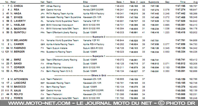 À l'issue de la seconde session qualificative ce matin, les sept constructeurs plaçaient tous une moto dans le Top 7 : Sykes, vainqueur de la toute dernière course au Nürburgring, hissait sa Kawasaki en tête devant Rea et sa "nouvelle" Fireblade équipée du ride-by-wire, puis Fabrizio sur l'unique Suzuki du plateau, Checa et sa Ducati semi-officielle, Haslam sur la BMW officielle, Haga et son Aprilia privée et Melandri sur sa Yamaha officielle.