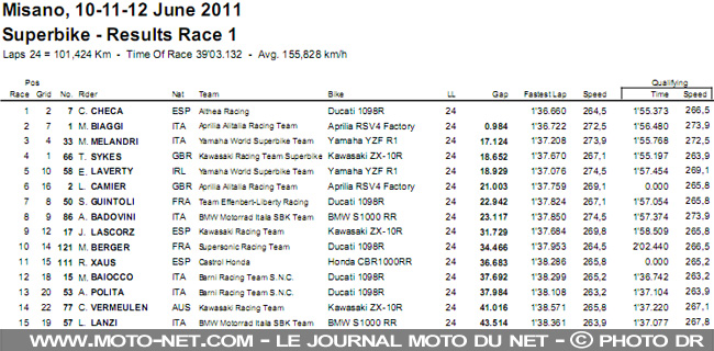 Devant, Checa semble avoir pris le dessus : il bénéficie au 19ème tour d'une avance de plus de deux secondes sur Biaggi. Melandri et Laverty tournent une seconde moins vite que les leaders... et une demie seconde au-dessus de Sykes ! Le "Grinner" pourrait-il finalement faire mieux que 5ème ?