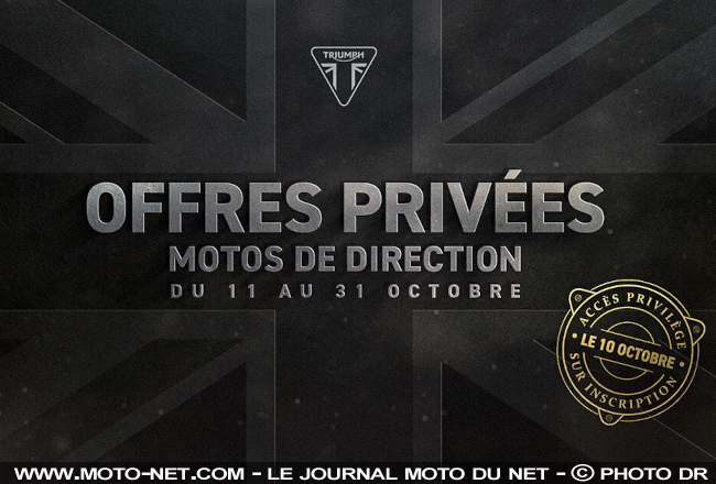 Amateurs de bons plans et de motos Triumph, à vos agendas : le constructeur anglais organise des ventes privées de "véhicules de direction (VD)" du vendredi 10 octobre au vendredi 31 octobre. "Une occasion unique de profiter de motos récentes, faiblement kilométrées, immédiatement disponibles et assorties d'avantages exclusifs", assure la marque d'Hinckley.
